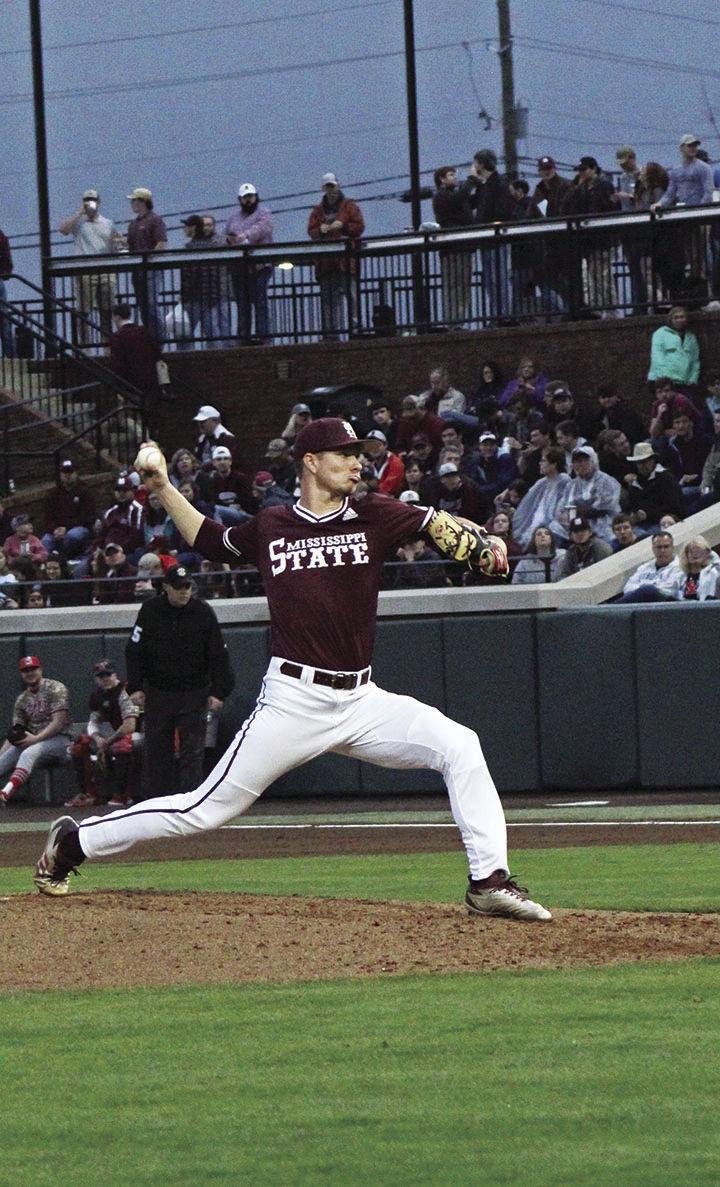 Senior right-handed pitcher Peyton Plumlee pitches two innings of the opening game on Feb. 15 at the Dudy Noble Field. MSU defeat Youngstown State 14-3 in the first game in the new Dude. Lany Wallace | The Reflector
